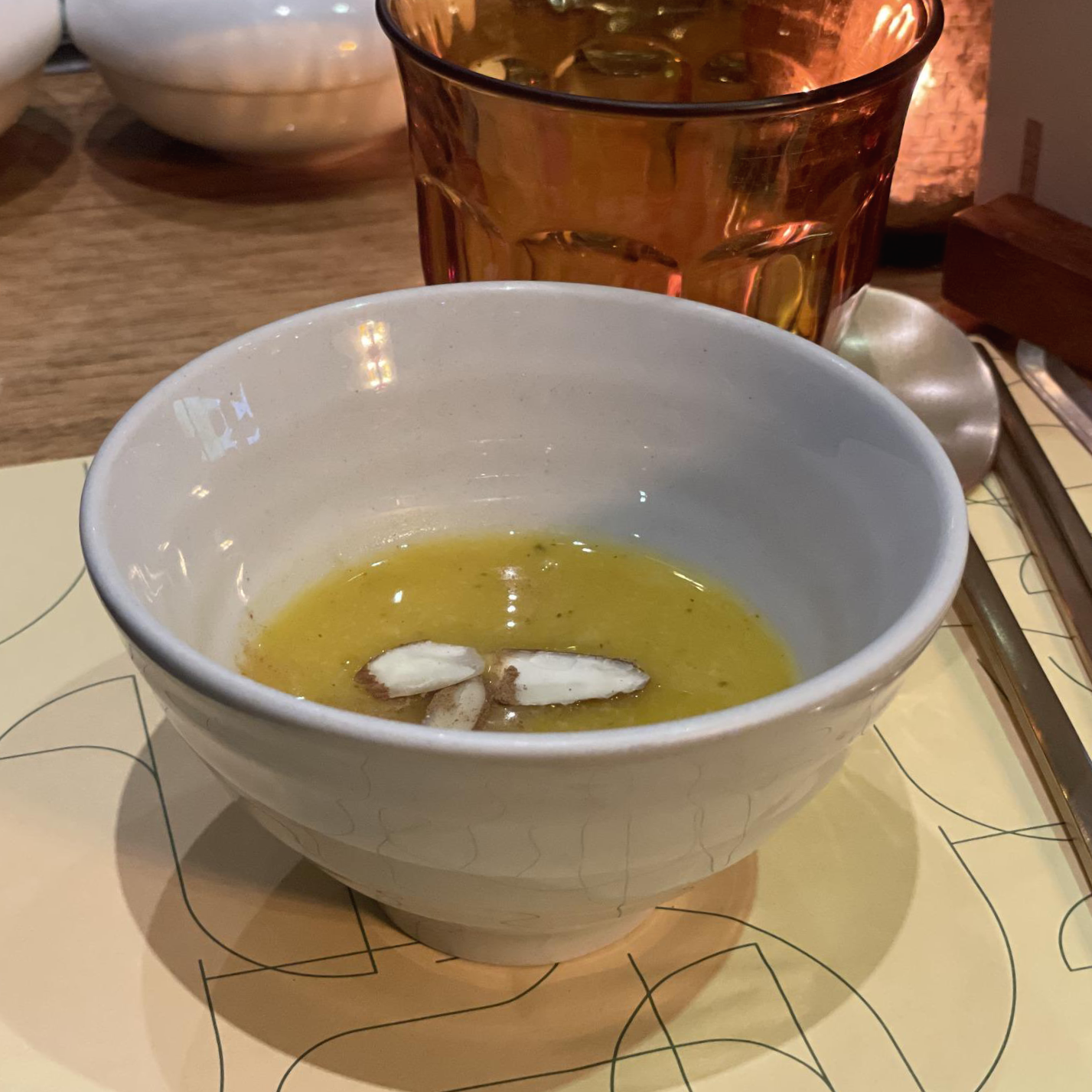 식사가 나오기 전에 애피타이저로 '호박죽'이 나온다. 따뜻하게 나오지는 않으며, 계피향이 약간 난다.
