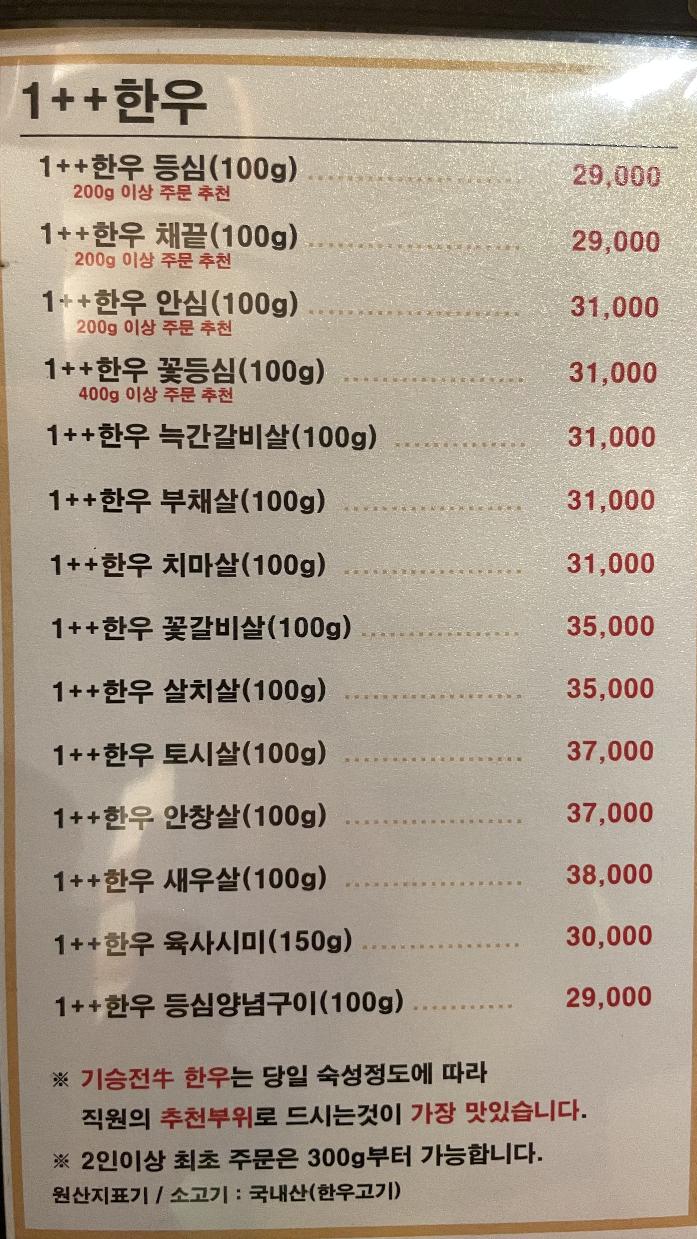 '1++한우'가 부위별로 있고, 방문 당일 추천하는 부위와 주문 불가능한 부위를 설명해 주신다.