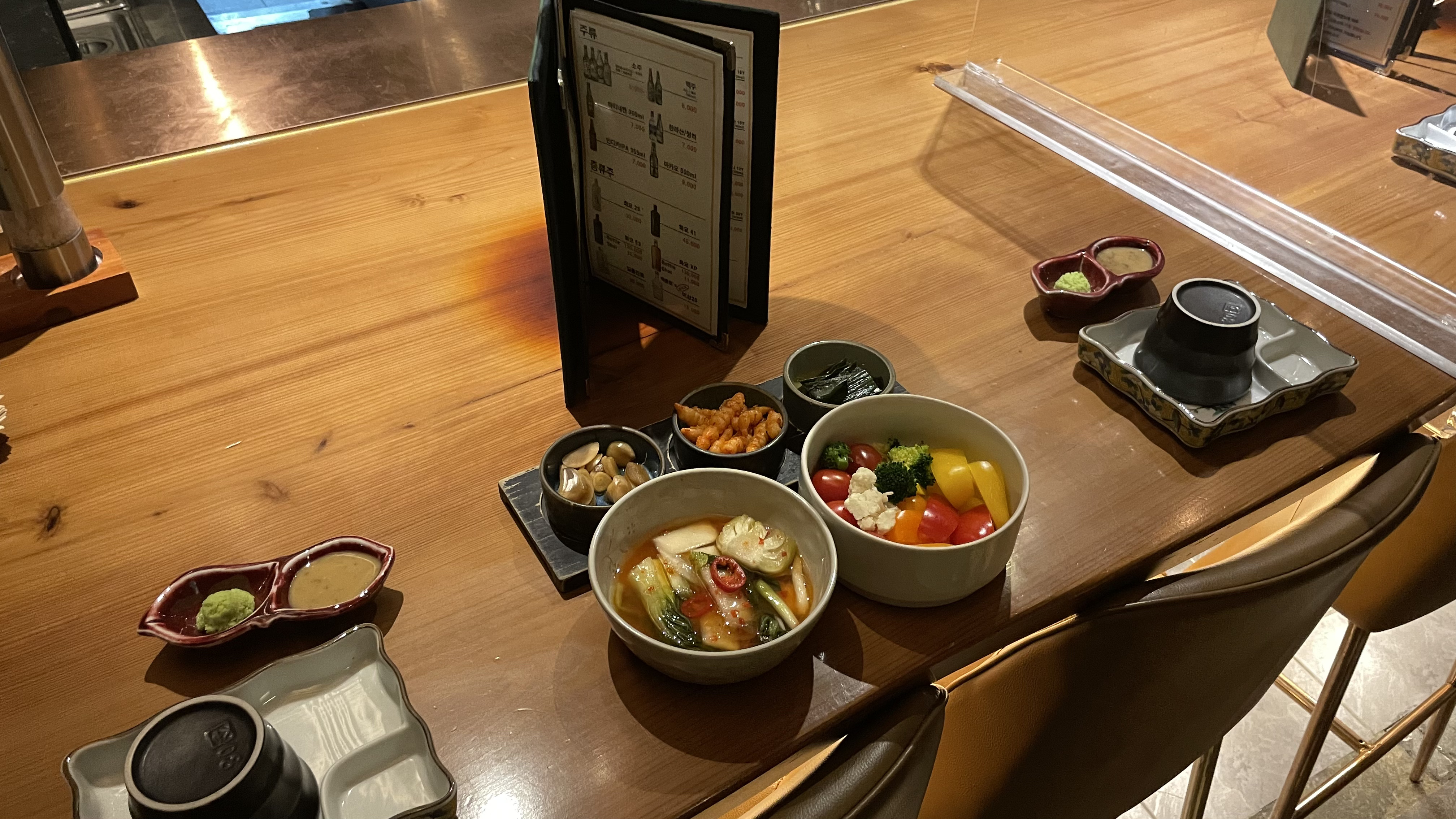 자리에 도착하면 밑반찬과 앞접시가 세팅되어 있다.