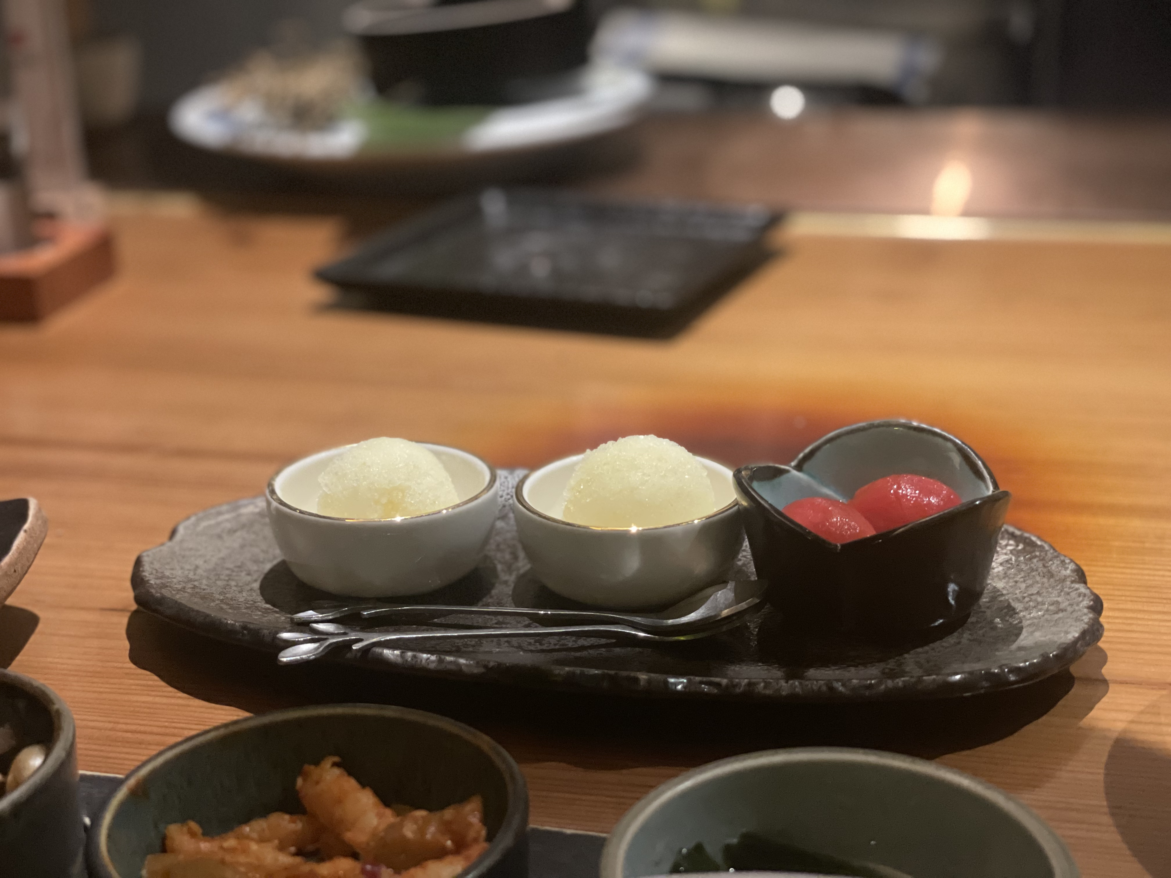디저트로는 '유자샤베트'와 '매실 방울토마토'가 준비되어 있다.
