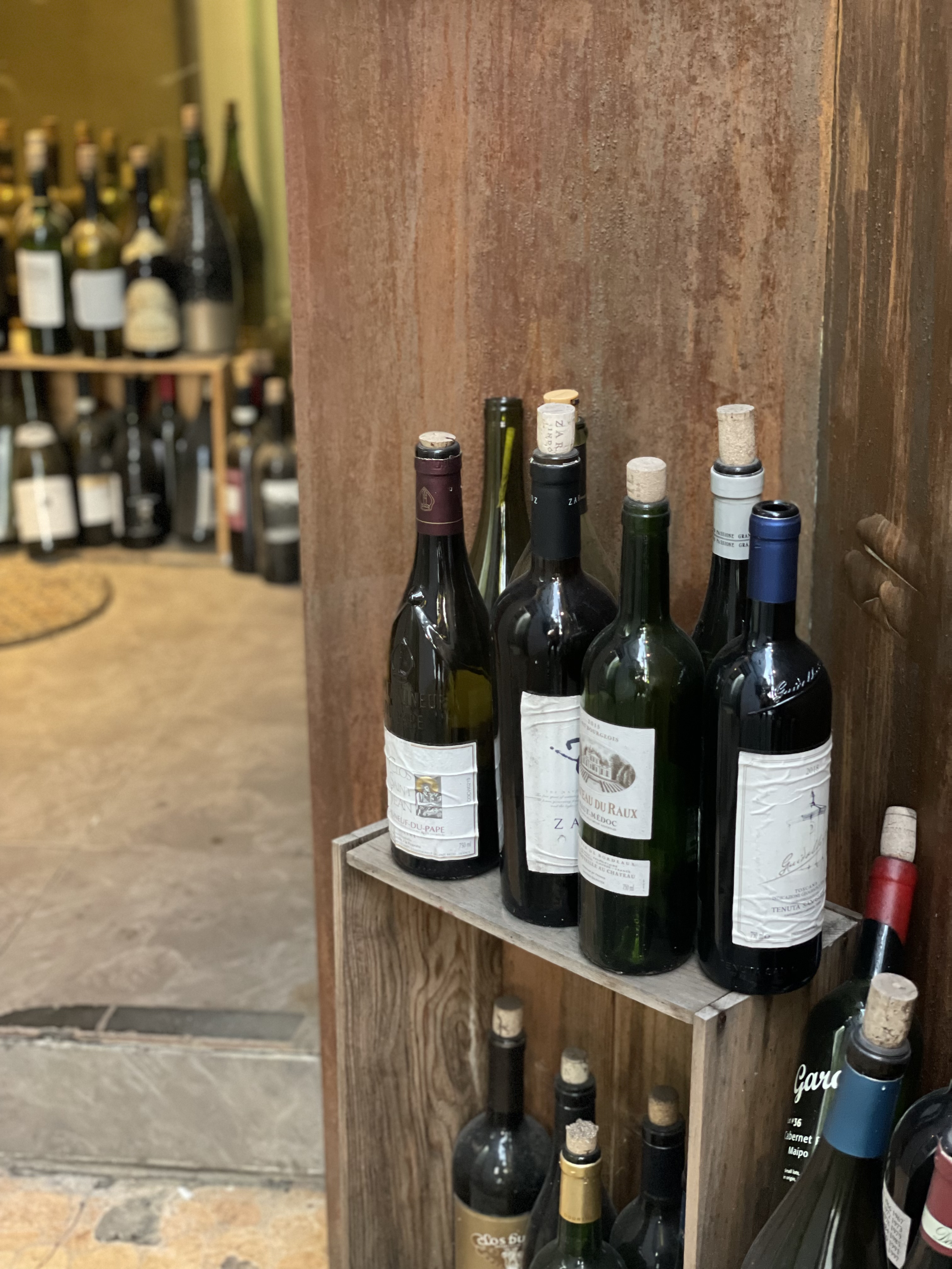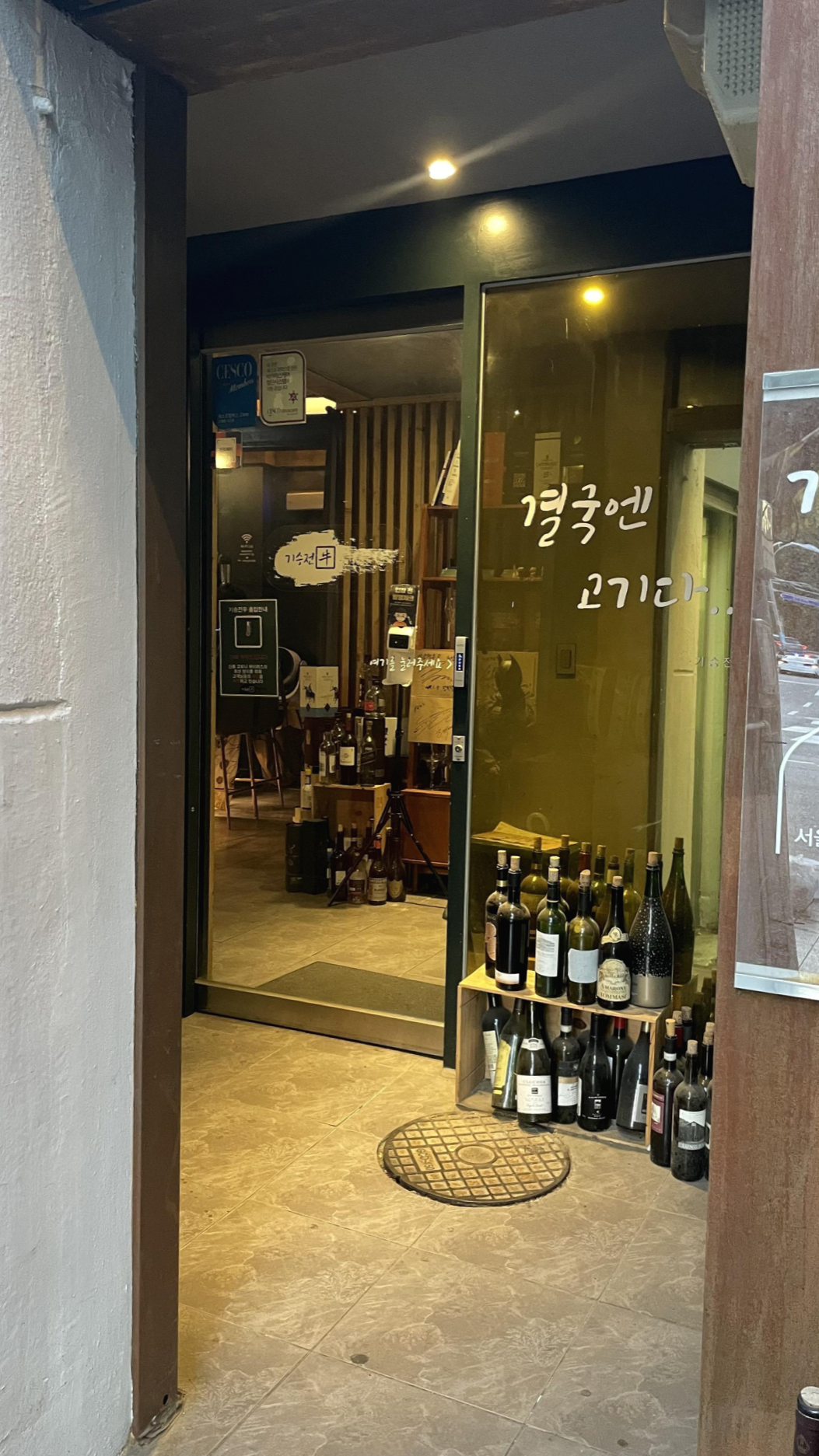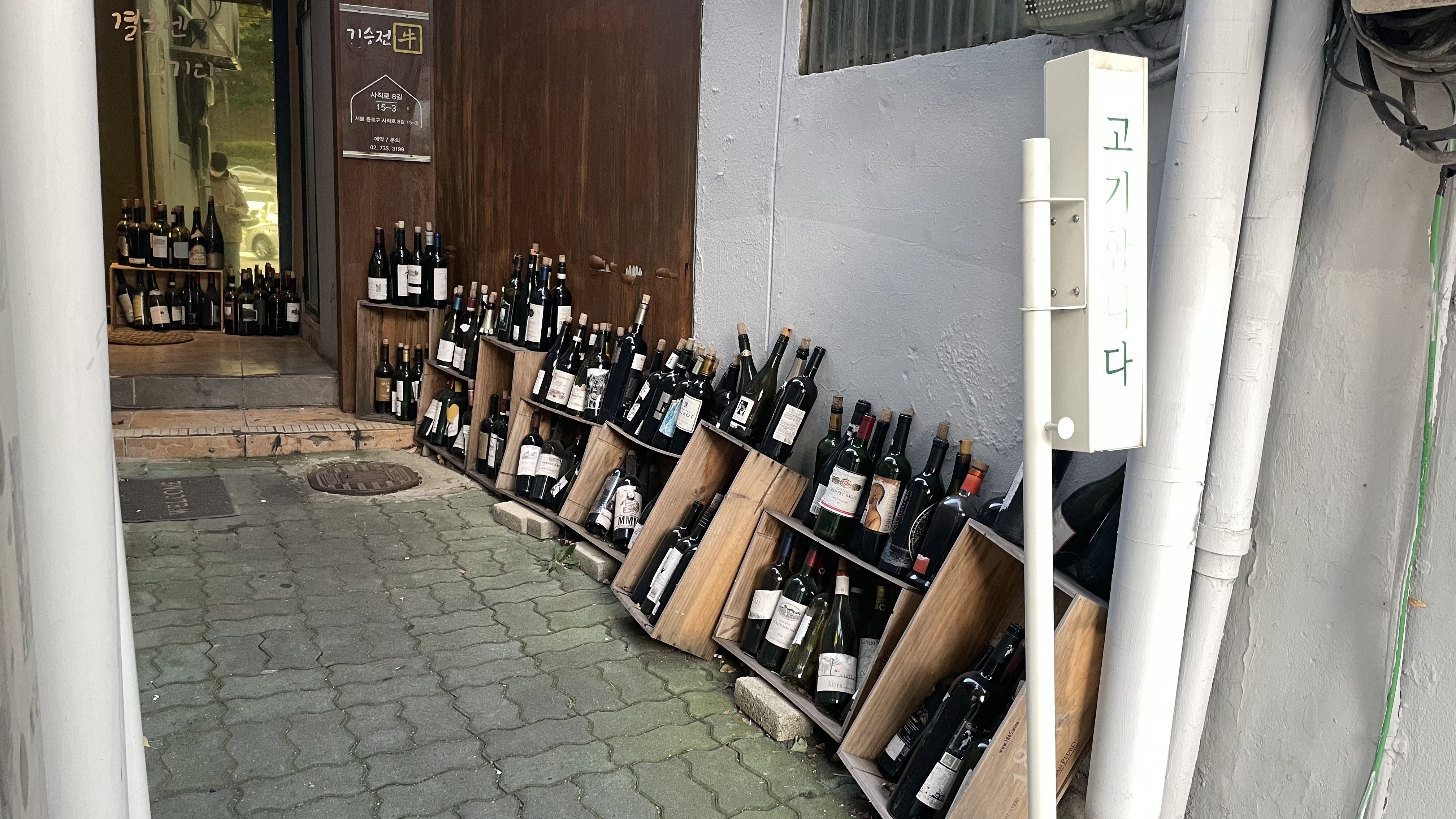 와인병이 쌓인 골목을 지나면 와인병이 쌓인 입구가 나온다. 결국엔 고기다..
